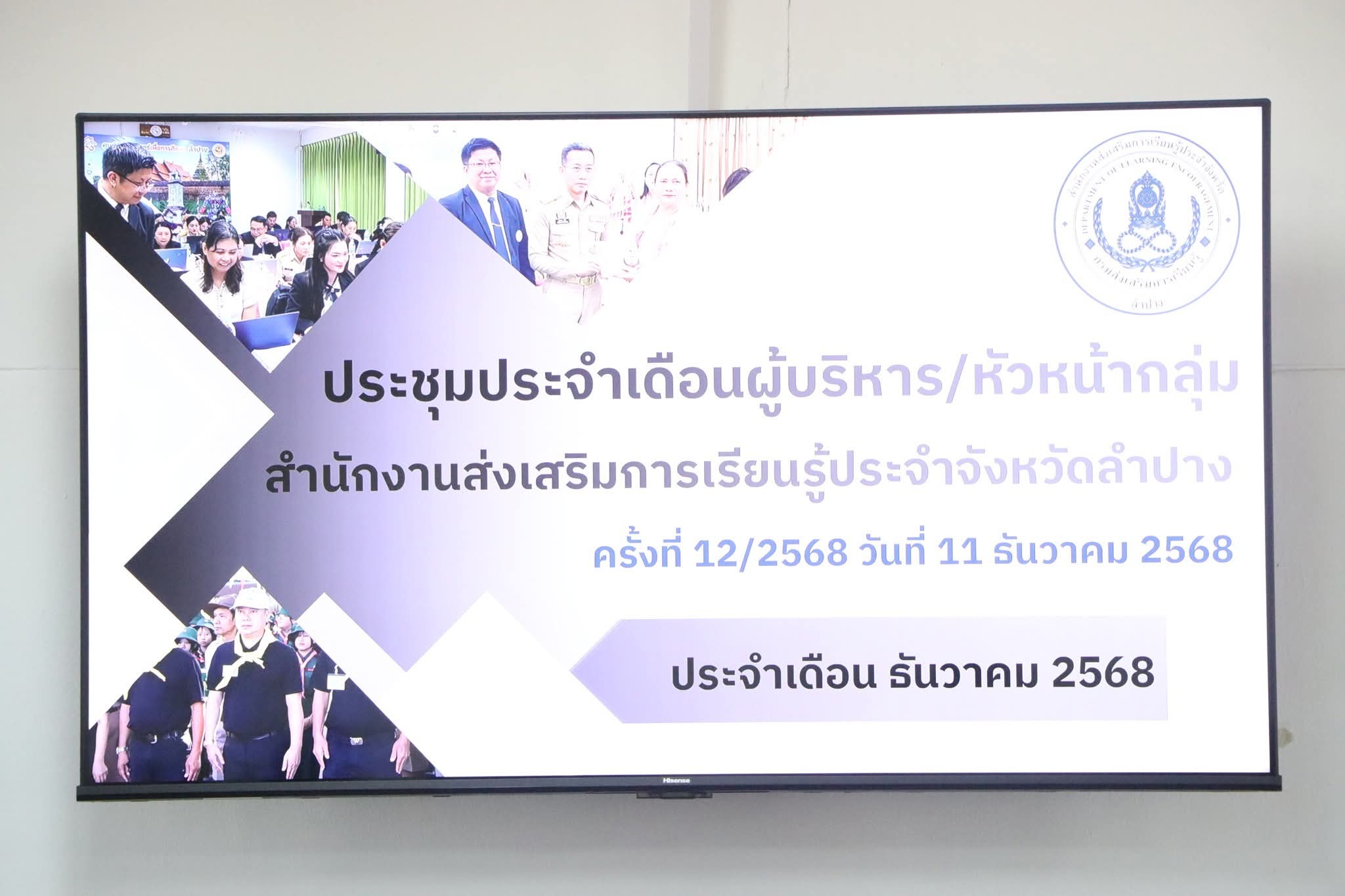 นายณัฐพงษ์ อังคะนาวิน ผู้อำนวยการศูนย์ส่งเสริมการเรียนรู้ระดับอำเภอเกาะคา พร้อมด้วยนาง จุฬารัตน์ อภิวงค์คำา ครูศูนย์การเรียนรู้ เข้าร่วมประชุมประจำเดือนผู้บริหาร/หัวหน้ากลุ่ม สำนักงานส่งเสริมการเรียนรู้ประจำจังหวัดลำปาง ครั้งที่ 12/2568 ประจำเดือน ธันวาคม 2568 โดยมี นายสมชาย เด็ดขาด ผู้อำนวยการสำนักงานส่งเสริมการเรียนรู้ประจำจังหวัดลำปาง เป็นประธานในการประชุม ณ ห้องประชุม 2 สำนักงานส่งเสริมการเรียนรู้ประจำจังหวัดลำปาง