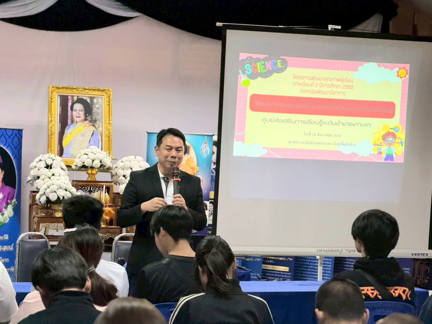 นายณัฐพงษ์ อังคะนาวิน ผู้อำนวยการศูนย์ส่งเสริมการเรียนรู้ระดับอำเภอเกาะคา เป็นประธานในพิธีเปิดโครงการพัฒนาคุณภาพผู้เรียน กิจกรรมพัฒนาวิชาการ ภาคเรียนที่ 2 ปีการศึกษา 2568 Spark Science จุดประกายการทำโครงงานวิทยาศาสตร์ จำนวน 51 คน เพื่อให้ผู้เรียนมีความรู้ ความเข้าใจ และได้ทักษะการจัดการเรียนรู้แบบโครงงานและเพื่อให้ผู้เรียนสามารถนำความรู้ไปจัดการเรียนรู้แบบโครงงานได้ โดยมีทีมวิทยากร จากศูนย์วิทยาศาสตร์เพื่อการศึกษาลำปาง ณ ศูนย์ส่งเสริมการเรียนรู้ระดับอำเภอเกาะคา จังหวัดลำปาง
