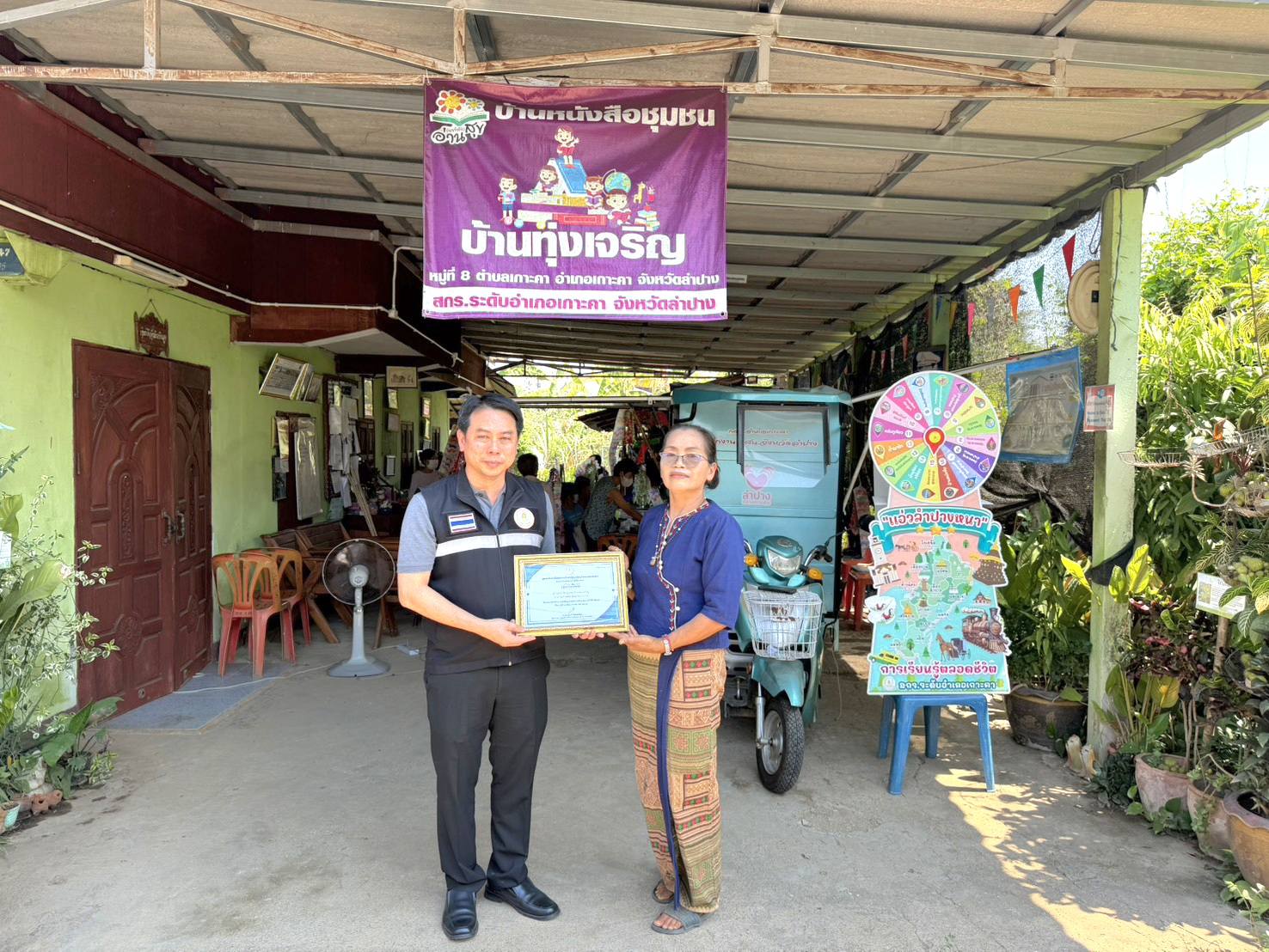 นายณัฐพงษ์ อังคะนาวิน ผู้อำนวยการศูนย์ส่งเสริมการเรียนรู้ระดับอำเภอเกาะคา มอบเกียรติบัตร บ้านหนังสือชุมชนดีเด่น ระดับอำเภอ ประจำปี 2569 ให้กับ นางสาวทิพสินีพนะการ เจ้าของบ้านหนังสือชุมชน เพื่อเป็นขวัญและกำลังใจในการดำเนินงาน ณ บ้านหนังสือชุมชน บ้านทุ่งเจริญ หมู่ 8 ตำบลเกาะคา อำเภอเกาะคาจังหวัดลำปาง