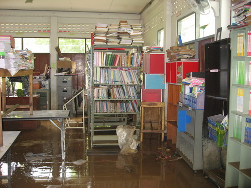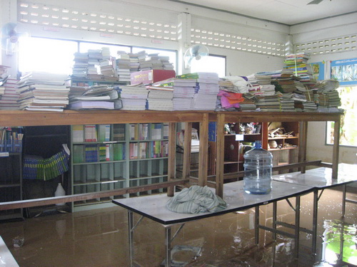 ผลจากน้ำท่วมในวันที 2 - 3 สิงหาคม 2554 ที่ผ่านมาทำให้ตู้หนังสือ หนังสือเรียน หนังสือทั่วไปได้รับความเสียหายเป็นอย่างมาก ตอนนี้กำลังตรวจสอบและประเมินความเสียหายทั้งหมด