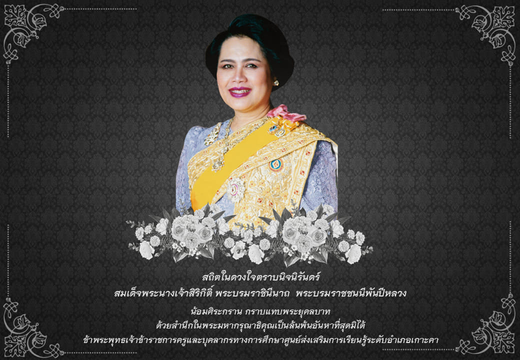 สถิตในดวงใจตราบนิจนิรันดร์ สมเด็จพระนางเจ้าสิริกิตต์ พระบรมราชินีนาถ พระบรมราชชนนีพันปีหลวง น้อมศิระกราบ กราบแทบพระยุคลบาท ด้วยสำนึกในพระมหากรุณาธิคุณเป็นล้นพ้นอันหาที่สุดมิได้ ข้าพระพุทธเจ้าผู้บริหาร ข้าราชการครู และบุคลากรทางการศึกษา ศูนย์ส่งเสริมการเรียนรู้ระดับอำเภอเกาะคา